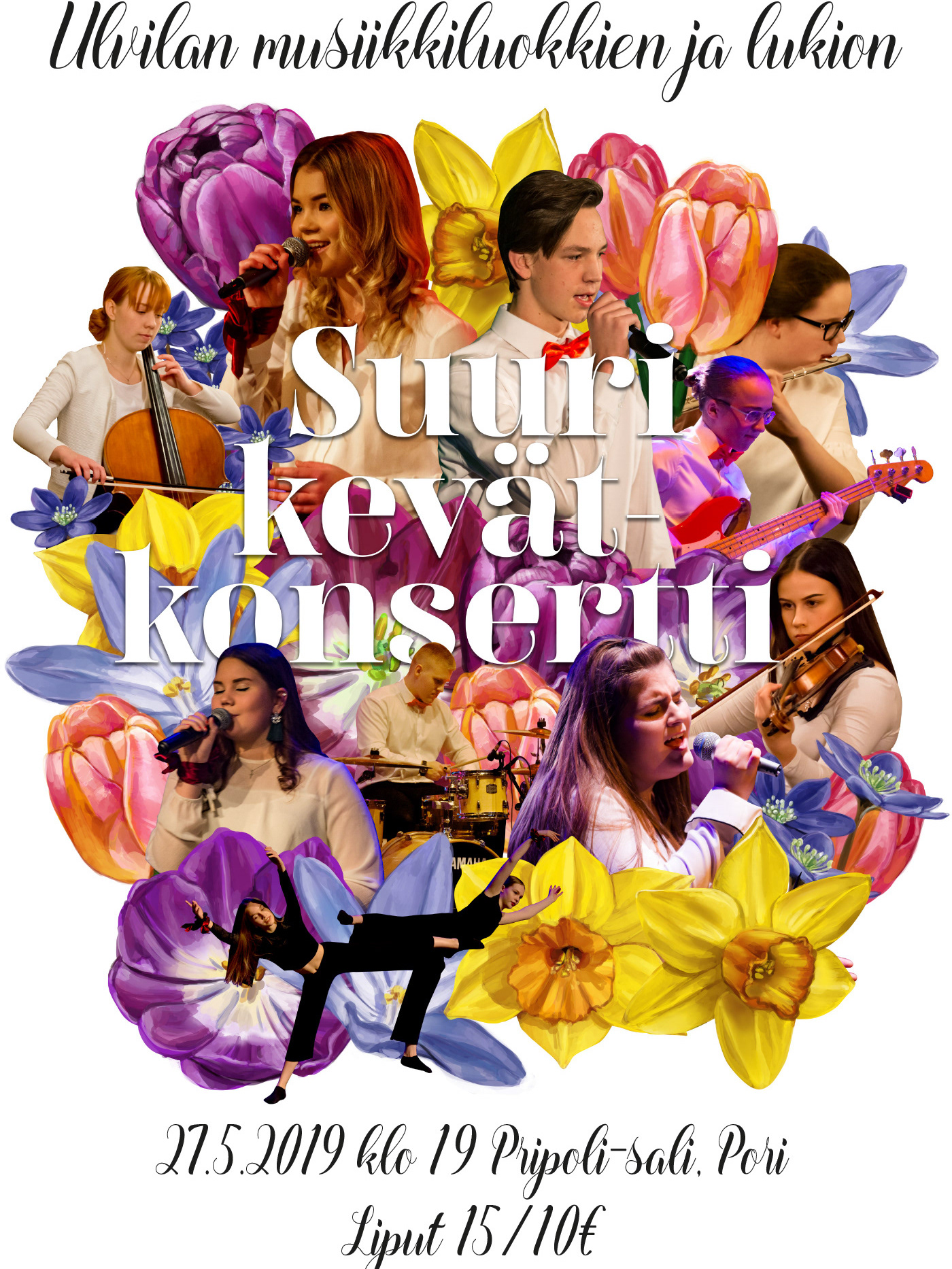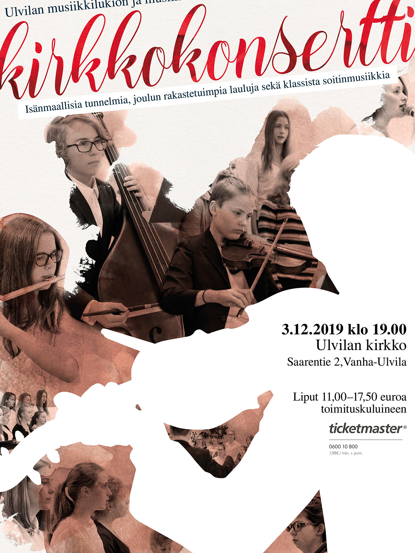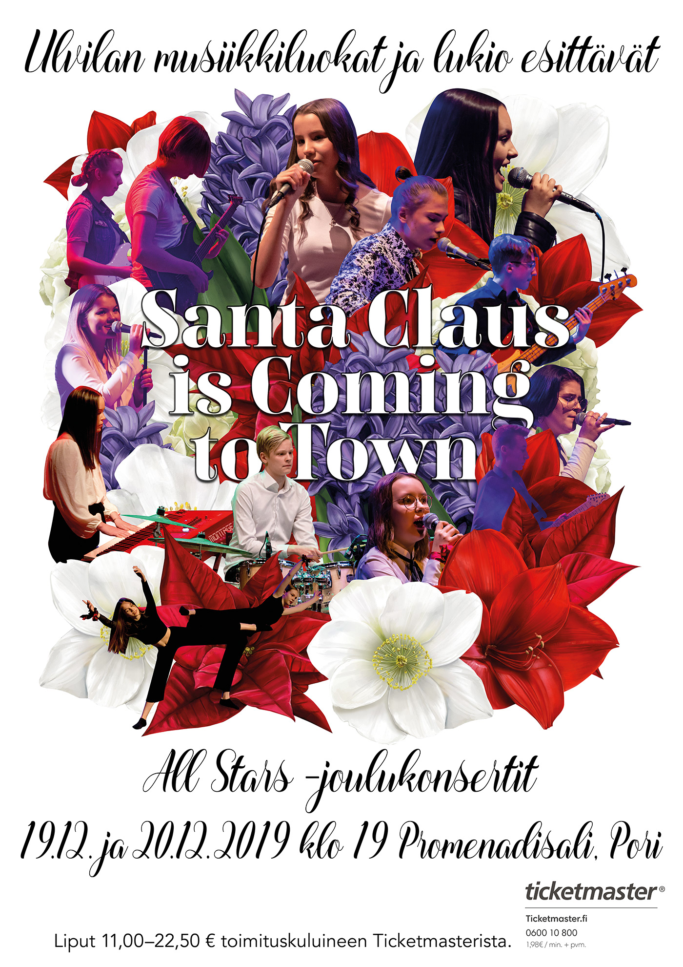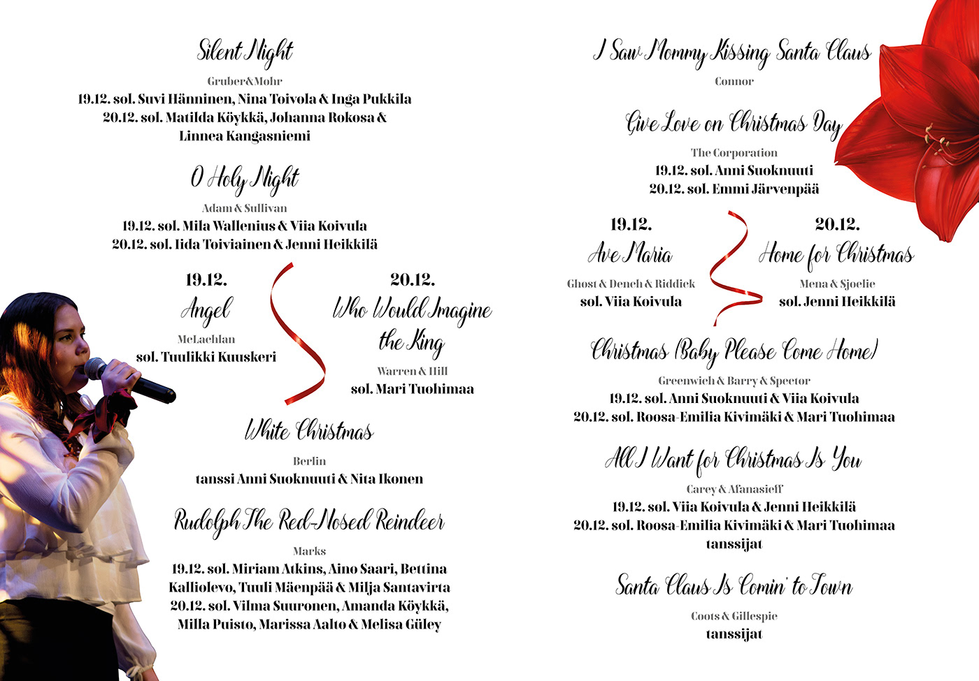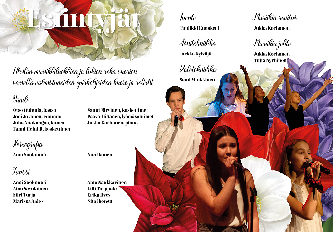 Poster and program design for Ulvila upper comprehensive and secondary school Christmas concert in 2019. I have illustrated the flowers and used photos I have taken.